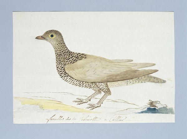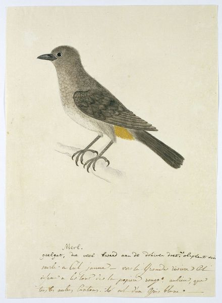 Editor: Here we have Robert Jacob Gordon’s, “Falco tinnunculus (Common kestrel),” possibly from 1778. It seems to be a watercolor and pencil drawing of a kestrel perched on a branch. I notice the artist included very precise measurements, almost like a scientific record. How do you interpret this work? Curator: The inclusion of measurements immediately draws my attention to the material conditions of its production. This isn't just an aesthetic exercise, but a form of labor. Gordon meticulously recorded this bird, turning observation into a kind of colonial accounting. The paper itself, the pigments used for the watercolor – where did these materials originate? How did their trade shape the representation? Editor: That's interesting. I hadn't thought about it in terms of colonial accounting, but the detailed notes do seem to serve a purpose beyond just art. Curator: Consider also the labor involved in creating the tools necessary to make this image: the manufacture of the pencils, the processing of pigments. It’s a chain of production reaching far beyond the artist’s hand, embedding this seemingly simple drawing in a network of trade and power. Were these tools readily available, or luxury items? Editor: So you're saying the artwork itself becomes a record of these material processes? It almost makes the drawing a commodity itself, subject to the same economic forces. Curator: Precisely! We can trace the relationships between artistic production and the broader social and economic landscape of the time. Editor: I hadn’t thought about approaching the artwork that way, but I realize I need to consider these elements more often. Thank you for offering that insight. Curator: Indeed! Focusing on the means of production reveals fascinating layers we might otherwise miss.