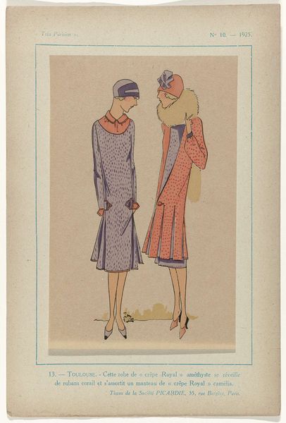 Editor: This is a watercolour illustration entitled "Très Parisien, 1926, No. 2, Pl. 18: - 5 C.V. Une robe de kash (...)" by G-P. Joumard from 1926. It's created using ink and held at the Rijksmuseum. The drawing presents two women dressed in stylish outfits; the style appears to be art deco. The composition has a strong illustrative quality and makes me think about fashion and gender roles. How do you interpret this work? Curator: It is fascinating, isn’t it? On the surface, it's a charming depiction of 1920s Parisian fashion. But let’s delve deeper. The rise of Art Deco coincided with significant social shifts for women, most visibly through their increased engagement in society and changing fashion norms, as displayed here. The "kasha" material being advertised—does this imply luxury accessible only to certain groups, potentially excluding others? Who is really represented by this image, and whose voices are unheard? Editor: That's an interesting point. I hadn't considered the socioeconomic aspect so explicitly, but you're right. It's marketing aspiration. Were women restricted from working in the Art Deco Era? Curator: In some ways yes, in others, the new social roles for women of the roaring twenties opened a venue for new female artists in commercial enterprises and design industries. Many women began working but might have found the highest level of economic mobility unavailable. Examining the creator could tell us more: What opportunities were accessible to female artists like G-P. Joumard during this period? Editor: This makes me rethink the artwork. It appears frivolous at first, but in its representation of the era’s fashions and consumer culture, it speaks to the social and economic tensions of the time. I initially saw stylish women; now, I perceive these illustrations as embedded in a larger narrative of class and evolving gender roles. Curator: Precisely. Art doesn’t exist in a vacuum, and by exploring these connections, we can achieve a far richer understanding of it.