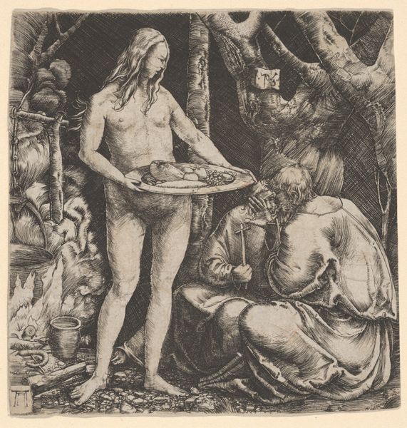 Editor: Here we have an engraving, "Bagpipe Player with His Lover," created by Master I.B., likely sometime in the Medieval period. There's an immediate sense of intimacy, the figures nestled together under a tree. What layers do you see beneath this seemingly simple scene? Curator: The bagpipe itself is a loaded symbol. Its drone has long been associated with the primal, with celebration, even carnality. Notice the way he looks at her, not at his instrument. The music here serves as a subtle backdrop to the real drama: the charged space between them. What do you think the inclusion of that large blade implies about the bagpipe player? Editor: Perhaps it’s a class indicator, suggesting he's a woodsman or huntsman. Or is it meant to imply some type of potential violence? Curator: Both readings hold merit. Think about medieval courtship rituals. Music and gifts were often bartered, displayed in pursuit. Yet, societal rules were strict, particularly concerning female virtue. This blade represents that razor's edge—the tension between desire and the potential for societal transgression. The artist encodes a complex relationship dynamic using just a few key objects. Editor: It's amazing how much unspoken narrative the artist is able to build. I had initially missed a lot of the subtext, and it's striking how effectively objects like the blade and the instrument themselves play as symbols here. Curator: Indeed, the artist's reliance on cultural symbols grants "Bagpipe Player with His Lover" a weight that speaks to a broader medieval culture, revealing the anxieties and values around love and transgression that remain relevant today.