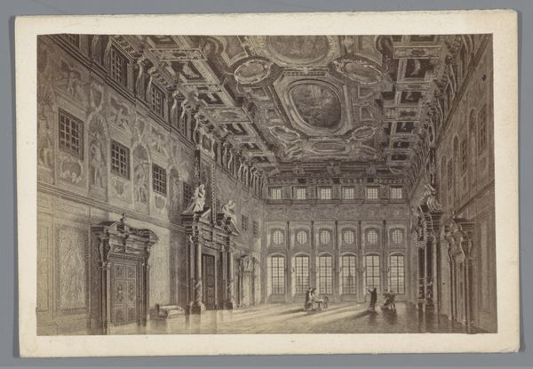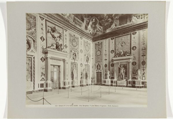 Editor: This is “Interieur van de vestibule van de Sint-Pietersbasiliek te Rome” which roughly translates to "Interior of the vestibule of St. Peter's Basilica in Rome," by Gustave Eugène Chauffourier, a gelatin silver print from around 1875 to 1900. The perspective is just incredible; it makes me feel so small. What cultural memory does this evoke for you? Curator: Well, first consider how photography itself began carrying the cultural weight of accurate representation at this time. The Basilica, heavily laden with Catholic symbolism, is itself an assertion of power and faith. But in this vestibule, we're in a transitional space. What feelings does that liminality evoke? Editor: That's interesting. It’s grand, but being a “transition” area, it almost feels empty or like a pause. I guess it's less about religious symbols here and more about architectural power? Curator: Precisely! The columns, the coffered ceiling – these echo classical Roman architecture, linking the church to the legacy of the Empire. Consider what that visual language communicates about the church’s ambitions and claims to authority. Look at the repeating geometric shapes too, how might they echo a certain order, even a divine order? Editor: So it’s not just a picture of a hallway, it's using the visual language of power, order and historical legacy! I never would have thought of all that just looking at it. Curator: And what of the light itself? Doesn't it almost seem to sanctify the space, bathing it in an ethereal glow? That too carries its own symbolic weight. How interesting that it should be captured in a medium hailed for its "accuracy". Editor: That contrast really makes me see photography differently; the choice of light and composition become more about meaning. Thanks! Curator: Indeed, it reminds us that even in capturing reality, the artist always shapes the narrative. A useful lesson.