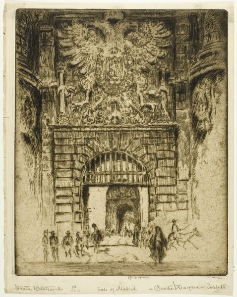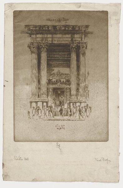 Editor: Here we have Joseph Pennell’s "Euston," an etching from 1886, printed on paper. The scene is dominated by the station’s architecture, but it's also teeming with figures and carriages. There's a beautiful sense of depth but something almost imposing in the depiction of the building itself. What stands out to you? Curator: It's fascinating how Pennell captures the grandeur of Euston station, but from a historical perspective, it also reveals much about the era. The Euston Arch, of course, served as a literal gateway to London and the promises it held, becoming an emotive symbol of empire. Pennell isn’t just documenting architecture; he's documenting the social theatre of Victorian London and its ambitions. Notice the flurry of figures at the entryway. Who are these people and what is this specific context? Editor: I hadn't considered the "gateway" aspect so literally. I was so caught up in the Impressionistic style, that I had not focused as much on the fact this was a functional transportation hub that has huge economic, political and social ramifications. The Arch acted almost as a Roman Triumphal arch, representing empire, industry, and perhaps social mobility all at once. Curator: Exactly. The "Euston Arch" operated, in the public consciousness, as a carefully crafted emblem that stood for the era. To add another layer to this reading of the imagery of the "Arch," consider how it became a matter of immense public controversy and discourse. It was demolished in the 1960s. The demolition generated a widespread sentiment of profound grief, in essence altering and cementing its public value. How do you think Pennell's choice of printmaking affects the work's message, considering it was easily reproducible for mass audiences? Editor: Well, by choosing printmaking, Pennell made the statement and impact far-reaching. The image could circulate widely, shaping public opinion about the railway, about London, about progress and empire. It's amazing to consider how the Arch was so much more than just a building! Thank you, I hadn’t fully recognized all that history within the artwork. Curator: And I had not looked at the Arch's later public importance after its demolition; food for thought!