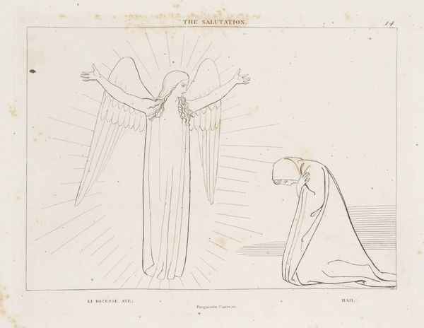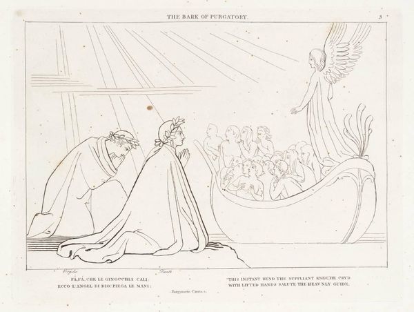 Curator: John Flaxman's "The Ninth Sphere" presents a fascinating visual interpretation of Dante's *Paradiso*. What strikes you most about it? Editor: It’s a very delicate line drawing, with figures reaching up towards a triangle of light. It feels… hopeful, but also a bit restrained. What do you see in it? Curator: I see a powerful commentary on the social hierarchies embedded within religious structures. Consider the positioning of the figures, their upward gaze. Who is included, and who is excluded from this vision of paradise? And what does it mean that this vision is filtered through a male artist's interpretation? Editor: So you're saying that even in depicting paradise, there are still power dynamics at play? Curator: Precisely. Flaxman's work, while seemingly devotional, invites us to question whose voices are amplified and whose are silenced in the construction of spiritual narratives. Editor: That gives me a lot to think about regarding the politics of representation, even in art about the divine. Curator: Indeed. By examining the historical and social context of works like this, we can uncover deeper meanings about identity, power, and the ongoing struggle for inclusivity.