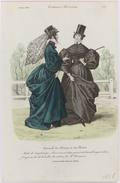 This color print from April 1862 presents new designs for riding habits, published in the "Gazette of Fashion" in London. These images are fascinating social documents, reflecting the era's rigid class structure and the aspirations of its upwardly mobile members. Consider the visual codes at play: the tailored jackets, voluminous skirts, and top hats signify not just fashion but also social status and gender roles. The image reinforces the idea of women participating in leisure activities, like horse riding, within strictly defined boundaries. The "Gazette of Fashion," as an institution, played a crucial role in disseminating these norms. It dictated what was considered appropriate and desirable, influencing the tastes and behaviors of its readership. Historians can draw upon a variety of resources to understand the deeper meanings embedded in such images – from fashion history and social etiquette manuals to economic data on the textile industry and the rise of consumer culture. This print reminds us that art is never created in a vacuum, but rather is shaped by the social, economic, and institutional forces of its time.