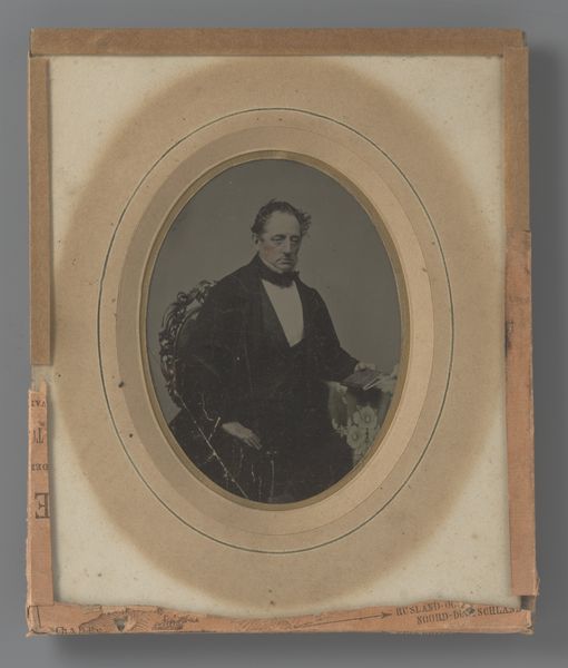 Editor: Here we have "Nieuwjaarswens van rechter Willis voor het jaar 1909", or Judge Willis' New Year's wish for 1909, made around 1908. It’s a daguerreotype photograph, attributed to Elliott & Fry. I'm struck by how formal the portrait feels, especially contrasted with the somewhat decorative frame around it. What can you tell me about this piece? Curator: Looking at this image, I'm immediately drawn to the materiality of the daguerreotype itself. Consider the laborious process involved in creating such an image – the careful coating and sensitizing of the silver-plated copper, the extended exposure time, and the meticulous development process. Each step reveals a dependence on material and technical conditions that fundamentally shaped early photographic practice. How do you think the constraints of this early photographic technology affected the final image and its intended audience? Editor: That's a really interesting point. I hadn't thought about how limiting the daguerreotype process must have been. It must have added to the gravitas because there wasn't much room for mistakes! How was the role of labor important in constructing notions of photographic art during this period? Curator: Exactly! These images were carefully constructed commodities. Notice also the studio mark of "Elliott & Fry." It was critical in that period to attach celebrity photographers with their famous clients as it solidified notions of high and commercial culture within photography. The labour of photographers became enmeshed with broader debates about authorship and copyright as photography industrialized. Editor: Wow, I’ve definitely learned to appreciate the history baked into these older photograph technologies, especially considering labor! Curator: And how even a formal portrait can be read as a product of materials and a wider set of social relations around image making.