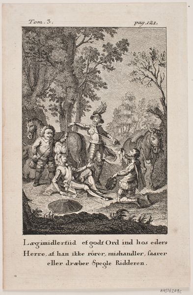 Editor: We're looking at "Nymphs under tree", an engraving by Cornelis van Jagen made sometime between 1706 and 1744. The scene feels rather chaotic, figures scattered amidst a densely wooded landscape. What strikes you most about its visual composition? Curator: Indeed, it is within the careful arrangement of forms and lines that we begin to decipher the artwork's meaning. Notice how the artist strategically uses hatching and cross-hatching. These lines do not merely describe form; they also create areas of dark and light. Note that the linear elements serve to define the forms, creating contrasts between light and shadow and establishing depth. Editor: That’s interesting. I see how the lines build up the figures and the landscape. So, if we focus on the linear patterns and light, what narrative or symbolic meaning do you think the artist intended to convey? Curator: Consider the placement of the figures. Their gestures guide the eye throughout the scene, a careful manipulation that controls the viewer's experience of the space. Consider, for instance, the upward reaching gestures contrasting with the kneeling form near what may be the edge of a pond. How do these contrasting forms impact the overall reading of the artwork? Editor: I guess it adds tension, visually pulling you in different directions and makes the eye wander from one detail to another, building anticipation. Curator: Precisely! It's not just about seeing the scene; it's about the experience of seeing it, how the eye moves through the composition, led by the artist’s hand. Editor: This close visual analysis has definitely given me a richer understanding of how much the artist’s technique and placement of figures matter. Curator: It demonstrates the power of form itself. The arrangement, the execution - all contributes to a unique aesthetic experience that transcends the mere depiction of a scene.