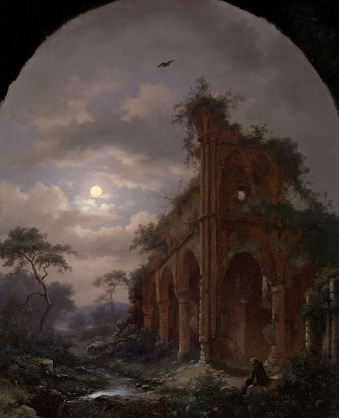 Carl Spitzweg painted this "Moonlit Scene with Castle Ruins" using oil on canvas, a traditional fine art medium. Look closely, and you’ll see how he’s built up layers of paint to create a rich, textured surface. The materiality of oil paint – its thickness and translucency – is key to the artwork's effect. Spitzweg's brushstrokes capture the rough texture of the stone and the soft glow of moonlight. The darkness is broken by the pale luminescence, using tone and texture to create a sense of depth. Spitzweg was part of the Biedermeier era, which turned away from grand historical themes to focus on intimate, everyday scenes. Yet here, we see a ruined castle, a vestige of an older social order, now crumbling. Oil painting, with its history of representing wealth and power, is used here to depict a scene of decay and quiet reflection. This challenges the distinction between high art and the more humble subjects that Spitzweg often depicted.