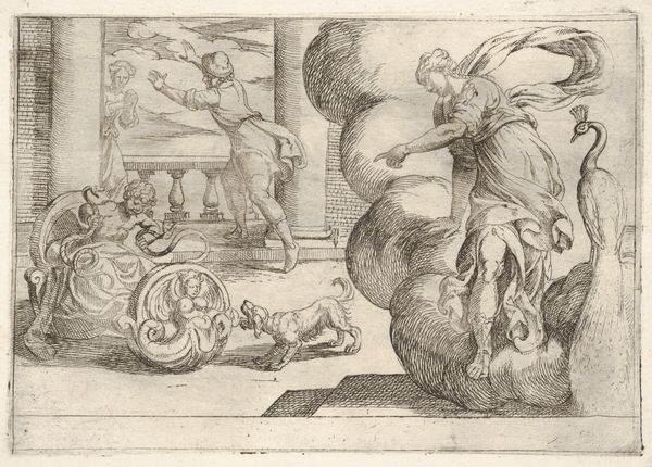 Editor: This is Antonio Tempesta’s "Hercules Strangling the Serpents". It's a small etching, only about 10 by 14 centimeters. The scene is so dramatic! What symbolic meanings do you find woven into this image? Curator: The infant Hercules's triumph over snakes is a powerful visual motif. Note how Tempesta links Hercules to virtue. The peacock, a symbol of Juno, who is, in turn, symbolic of jealousy, represents the adversity he must overcome. Editor: So, the peacock isn’t just decorative? Curator: Not at all. The image is dense with symbols. The dog perhaps represents fidelity, the woman represents Hera. The image encapsulates the beginning of his lifelong trials. It is a potent narrative of destiny and inherent strength. Editor: I see it now. It’s fascinating how much meaning can be packed into such a small space.