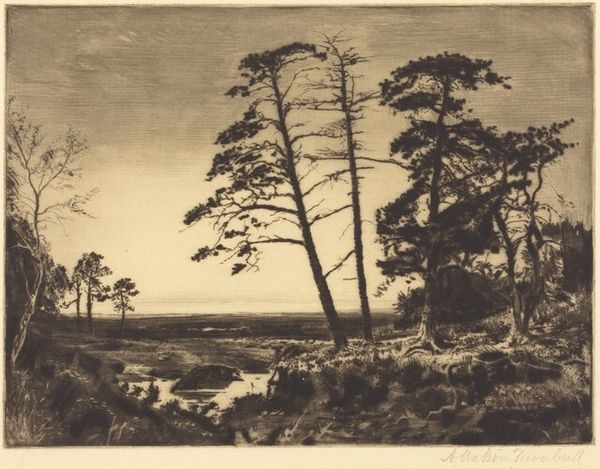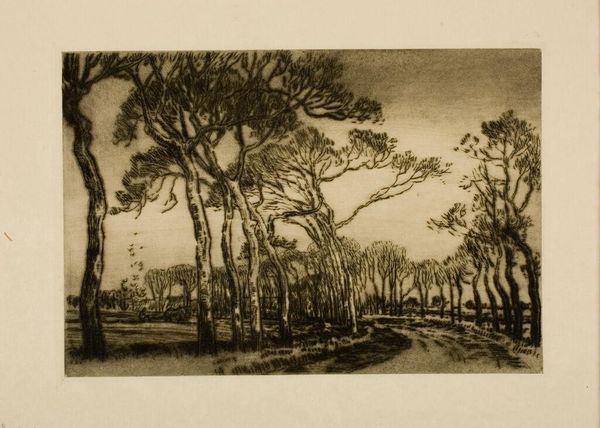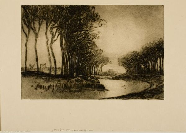 Curator: This is Leopold Hugo’s Row of Poplars, currently residing at the Harvard Art Museums. Editor: It’s evocative; that regimented line of trees creates such a strong sense of melancholy. Curator: Hugo's work often reflects an interest in the changing landscape and human intervention, doesn't it? You see the impact of land management in even such a simple scene. Editor: Absolutely. And observe how the artist uses the verticality of the trees against the horizontal plane of the water to create depth and a sense of enclosure. Curator: Yes, and in its time, this quiet reflection on the landscape offered a counterpoint to rapid industrialization narratives. Editor: Well, whatever the context, the formal repetition and tonal values create an atmosphere that is nothing short of haunting. Curator: A haunting reminder of our relationship with nature, indeed. Editor: Yes, a study in contrasts, both visually and conceptually.