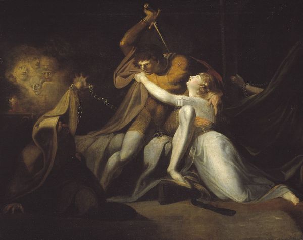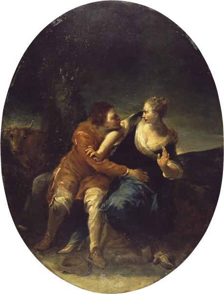 Curator: We are standing before Giuseppe Maria Crespi’s “Tarquin and Lucretia,” painted around 1700 using oil paints. What strikes you immediately about this piece? Editor: The dramatic tension is palpable. It’s heavy with impending violence and violation. The chiaroscuro lighting enhances the unease. The woman's expression is wrenching, capturing that stark terror of absolute powerlessness. Curator: It's fascinating how Crespi frames this particular moment, steeped as it is in sociopolitical undertones. The narrative itself is rooted in Roman history, telling the story of Lucretia, whose rape by Tarquin, the Etruscan king's son, precipitates the overthrow of the Roman monarchy and the establishment of the Republic. Editor: Exactly. It's not merely a historical painting; it’s a loaded depiction of male authority and its horrific abuses. Looking at it through a feminist lens, the image painfully reflects a historical legacy of sexual violence used as a tool for political upheaval and control. Lucretia becomes a symbol, perhaps an unwilling one, for the fight against tyranny, and the creation of a new civic order. Curator: Crespi, known for his innovative approach, avoids the theatrical grandeur typical of baroque art. His is a more intimate, visceral rendering. Editor: Yet, this intimacy intensifies the discomfort. By stripping away the grandiosity, Crespi confronts us with the stark reality of the assault. The rose that has fallen to the ground, and even the positioning of Tarquin's hand stifling Lucretia’s protest, contribute to its uncomfortable portrayal of dominance and subjugation. I can't help but wonder, viewing this from a modern perspective, how it might function as a tool for critical examination and education? Curator: Indeed. By confronting such narratives, institutions like museums take an active role in public dialogues concerning power, gender, and ethics. We consider how displaying such a difficult piece today might provide valuable opportunities to grapple with historical injustices and encourage empathetic discourse. Editor: I think situating this artwork alongside contemporary feminist writings and works by modern artists exploring similar themes might make a strong and poignant curatorial statement. Curator: It's been a worthwhile experience, thinking critically about Crespi’s rendition, recognizing it’s place in the grand narrative and the challenging socio-political questions it raises. Editor: I agree. Reflecting on the history that precedes us compels a crucial reassessment of contemporary challenges.