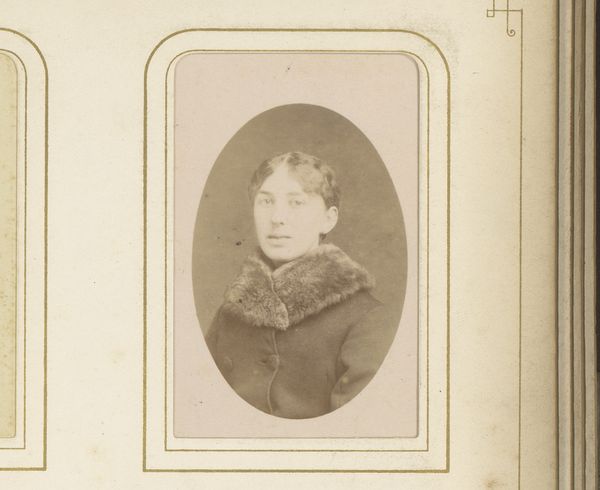 Curator: Before us is an intriguing gelatin-silver print titled "Portret van een meisje met hoed," created sometime between 1850 and 1890. Editor: It’s quite arresting, isn’t it? There’s a certain gravity in her expression that contrasts sharply with the light, almost whimsical quality of her dress and hat. I immediately want to know her story. Curator: The romanticism present here can be located primarily in the tonal gradations and overall softness of the image, something beautifully enhanced through the medium itself. The oval frame isolates and emphasizes the figure, pushing us toward the figure’s ideal form rather than something literally indexical. Editor: Indeed, though I wonder about that framing too. It serves not only to romanticize but also, perhaps unintentionally, to confine. This was an era where women's roles were heavily proscribed, and such visual choices might, subtly, point toward these social restraints—her potential is curtailed. Is she contained or celebrated? Curator: That's certainly an interesting consideration! From a purely structural viewpoint, note how her attire complicates such interpretations. The floral decoration draws attention, and the off-center positioning helps guide the eye through a constellation of pleasing compositional choices. Editor: Agreed, and her gaze certainly holds power. It is direct and a bit challenging. Considering the relative rarity of women owning their image at that point in history, the girl here exercises her gaze, not just at the camera, but indirectly at us. And this form of directness—dare I suggest resistance?—becomes something for consideration and critique. Curator: Undoubtedly, and such complexity speaks to the beauty found here. There’s more here than simple representation; there’s construction. And, importantly, a visual moment from history continues speaking to us. Editor: Yes. And reminds us that even a seemingly simple portrait can carry layered narratives of power, gender, and social expectation—histories rendered visible.