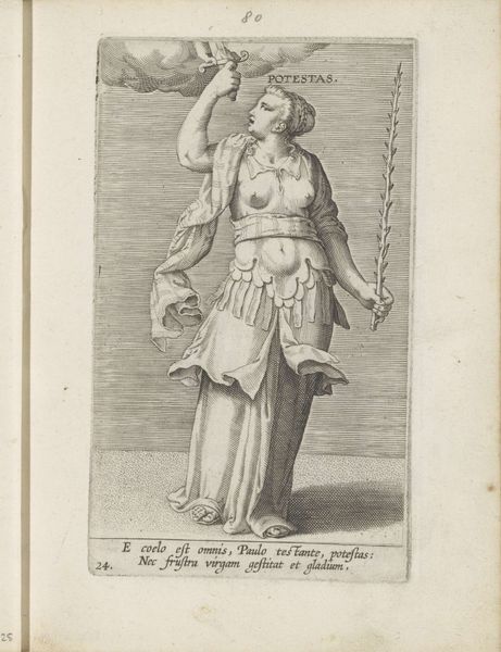 Editor: Here we have Philips Galle's engraving, "Ongerustheid," or "Anxiety," made around 1585 to 1590. It depicts a woman holding symbolic objects. I’m struck by her almost weary expression, and the strange combination of items she’s presenting. What do you make of the symbolism in this piece? Curator: The title, Inquietudo, is key here. The woman embodies the concept of anxiety. Note the objects: a rattle, traditionally used to soothe infants but hinting at the superficiality of comfort. In her other hand, she holds an apple with a scale upon it. Editor: A scale? Curator: Indeed. Scales represent a lack of balance and also constant evaluation. Look at the little squirrel too, it symbolizes restlessness and the fruitless pursuit of possessions, often associated with anxiety. See how each symbol reflects internal agitation. Even her clothing is loose and disheveled adding to the sense of disarray. Do you see it now? Editor: I do. So, anxiety isn’t just a feeling but a collection of restless behaviours and imbalanced thinking. The artist shows that in visual symbols! I find it so interesting to learn what certain images represented at the time. Curator: It's a window into the past and the ways anxiety was conceptualized through readily understood imagery of the period. Hopefully, the images serve their due purpose. Editor: Thanks for the explanation.