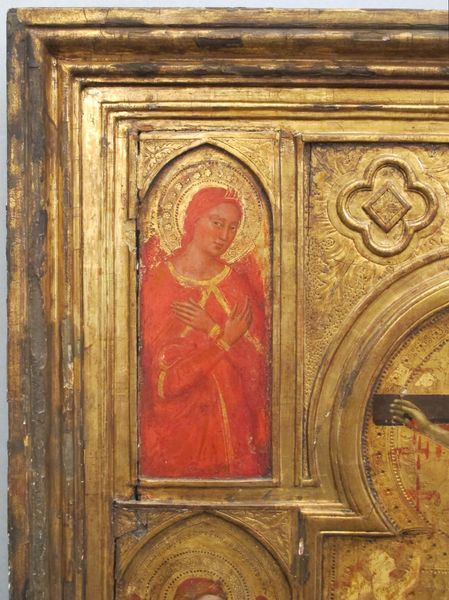 Curator: What strikes me immediately is the bifurcation—two distinct scenes vying for attention within a single panel. Editor: Indeed. We are looking at "Da Spedale Della Misericordia, Predella 3, Presentazione Al Tempio E Orazione Nell'orto," crafted around 1370 by Giovanni da Milano. It’s a tempera painting that masterfully captures two pivotal biblical narratives. Curator: The spatial composition is intriguing. The Presentation at the Temple on the left, a somewhat static, architectural affair with cool blues, contrasts sharply with the dynamic drama of the Agony in the Garden on the right, where darker, earthier tones prevail. Note how line and form articulate depth despite the work’s flat, medieval character. Editor: This contrast speaks volumes about the societal function of religious art at the time. The piece likely served as a didactic tool, offering the public—many of whom were illiterate—easily digestible, visually compelling moral lessons tied to their own civic identities through charitable institutions. Curator: I concur on its didactic function, but let's not overlook the aesthetic impact. Observe the deliberate use of color and its symbolic intent. The intense blues surrounding Mary in the temple scene speak to her divine role, while the earthy browns in the garden scene establish a connection between Christ’s human struggle and nature itself. Editor: Absolutely, the artistic choices were far from arbitrary; yet we should consider the commissioning context of the time. The "Misericordia," a charitable institution, sought not only to depict holy scenes but also to foster public identification with values such as compassion, redemption, and service – thereby reinforcing societal hierarchies within a spiritual framework. Curator: I maintain that the painterly execution of the scenes has aesthetic value regardless of its setting, as evidenced by Giovanni da Milano’s manipulation of pictorial space. Though the two panels clearly depict space and time, they seem to hover about one another as objects in an ambiguous field—a sign, in my eyes, of its modernity. Editor: Ultimately, viewing "Da Spedale Della Misericordia" presents a multilayered experience—where formal technique intersects with societal role, narrative power enhances political goals, and private experience intertwines with a community of shared values. Curator: I agree; and perhaps its genius lies not just in illustrating biblical stories, but also subtly underscoring the tensions between piety and power through meticulous arrangement.
