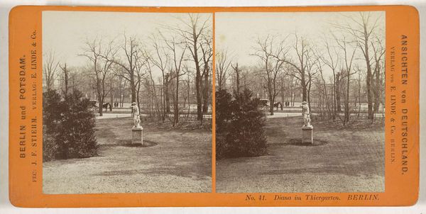 Editor: This gelatin silver print, "Gezicht op het Drostenhuis in Assen," was captured by Johannes Gerardus Kramer sometime between 1868 and 1890. The symmetry and the starkness of the trees give it a formal, almost austere feel. What stands out to you in this piece? Curator: What I notice is the stark contrast between the rigidity of the formal landscape and the subtle suggestions of human activity. Consider the implications of the closed gate and the people off to the side. What power structures are suggested here, and how might class be depicted? Editor: So, you're saying the photograph might be hinting at social dynamics? I hadn’t thought of that. Curator: Exactly. Think about who might have access to the Drostenhuis and who is relegated to the periphery. The very act of photographing this scene by Kramer also implicates him. Is he an outsider looking in or a member of that elite? We can explore how photography, even landscape photography, reproduces social hierarchies. Editor: That’s a really interesting point. It makes you wonder about the choices Kramer made in framing the scene, and who this image was intended for. Curator: Indeed. Images like this are not simply neutral recordings; they are products of specific cultural and historical contexts and reflect existing power relations. How does viewing the work through this lens change your perception of the piece? Editor: It definitely makes me see more than just a pretty landscape. It highlights how even seemingly objective depictions can be loaded with social commentary, even unintentionally. Curator: Precisely! And that's what makes art history such a powerful tool for understanding not just art, but the societies that create it. Editor: Absolutely, this has definitely given me a new perspective. I’ll never look at a landscape quite the same way again!