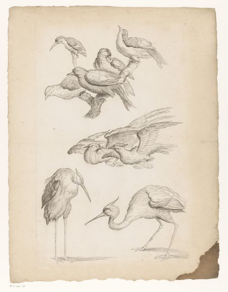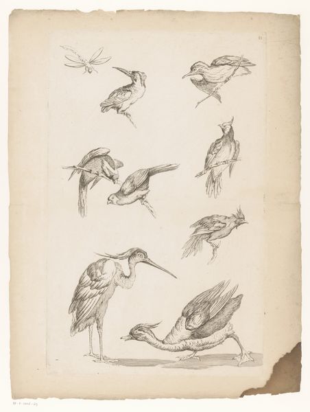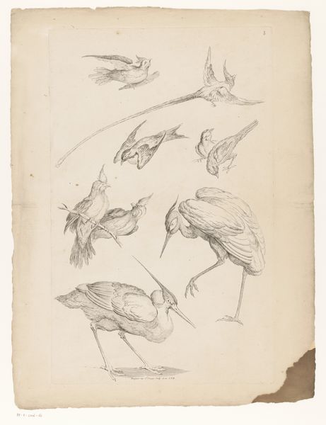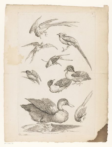 Gabriel Huquier created "Zes Chinese vogels," or "Six Chinese Birds," as an etching sometime in the 18th century. Immediately, one is struck by the delicacy of line, a meticulous arrangement that captures the birds with anatomical precision. The monochromatic palette, achieved through fine hatching and cross-hatching, lends the scene a sense of quietude and formality. This composition isn’t just a faithful depiction; it engages with the philosophical currents of its time. The Enlightenment’s emphasis on observation and classification is palpable, but the arrangement of the birds is far from taxonomic. The clustered composition encourages a semiotic reading where each bird is a signifier, contributing to a larger narrative about natural philosophy and perhaps even the relationship between the observer and the observed. Consider, finally, the texture achieved through the etching process. This is not merely aesthetic, but structural. The visual texture invites a haptic engagement, a desire to touch and understand the very materiality of the image. "Zes Chinese vogels" operates at the intersection of art, science, and philosophy, reflecting a world where seeing is not just believing but also a form of knowing.
