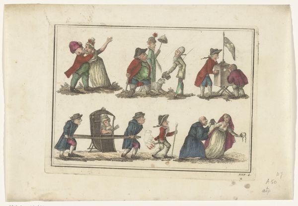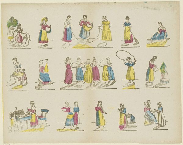 This is “Figuurstudies” (Figure Studies), made by Gesina ter Borch, sometime in the 17th century, using pen in brown and gray, brush in gray, and watercolor. Gesina ter Borch lived during the Dutch Golden Age, a time when the Netherlands experienced unprecedented economic, scientific, and artistic growth. As a woman artist in the 17th century, ter Borch occupied a unique position. Her gender shaped both her access to artistic training and the subjects she depicted. Unlike her male counterparts who often focused on history paintings or portraiture, ter Borch specialized in domestic scenes and portrait studies. This piece offers insight into the dress and activities of women in the 17th century. Although the figures here are unnamed and un-individualized, consider how they reflect the social status and gender roles prevalent in Dutch society at the time. This work not only showcases ter Borch's artistic skill, but also provides a glimpse into the daily lives and social dynamics of the 17th century Dutch Republic.