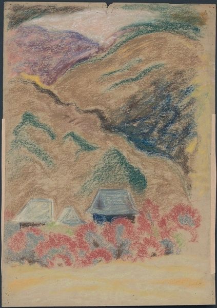 Editor: This drawing, "In the Swiss Alps" by Jan Wiegers, seems to capture the landscape in pastel and yet it’s not soft or traditionally pretty, but has a kind of urgent energy to it. I'm struck by how he uses colour and line to define space, what do you make of it? Curator: Well, its formal qualities are certainly the key to its effect. Consider the line – the deliberate, almost violent application of pastel, which does not so much describe the mountains as construct them, rebuilding nature according to its own internal logic. The planes of colour seem arbitrary at first, yet they operate within a visual architecture – a clear and precise symbolic articulation. Editor: So, it's about how it's put together rather than representing something accurately? Curator: Precisely. Note the restricted palette – earth tones combined with cool blues and violets. These choices aren’t merely descriptive, they are fundamentally structural, almost acting as linguistic devices. This creates a clear semiotic discourse, which invites you to question not what is depicted but why these formal decisions were made. Editor: So it's about the language of the artwork? I suppose if we were looking at, say, the Swiss culture at the time, we'd miss the point? Curator: To a certain extent, yes. To bring in the cultural at this point is simply superfluous. We begin by considering how it signifies internally, rather than what it reflects externally. How does its internal network operate, quite apart from any notion of "Swissness"? Editor: That makes sense. It’s a good reminder to really look at the artwork itself, without immediately jumping to context. Thanks. Curator: Indeed. And remember, that the arrangement is the arrangement. The mountain stands simply and complexly itself!