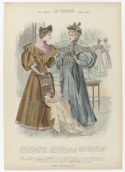 This fashion plate, "Le Moniteur de la Mode, 1879, No. 1660", now residing in the Rijksmuseum, presents an intriguing study in line, color, and form. The composition is divided vertically, with two figures occupying separate yet connected spaces, rendered in contrasting palettes. On the left, a figure in a pink striped gown stands against a muted background, while to the right, a seated woman’s blue dress provides a stark contrast, each articulated with intricate detail and texture. The artist uses line to define the figures, and to create depth, especially in the elaborate folds and frills of the dresses. The two figures and the division of space may suggest a semiotic exploration of femininity and fashion. The contrast between the vertical and horizontal orientations, along with the varying textures of the fabrics, invites us to consider how these visual elements challenge conventional representations of beauty and elegance. Notice how the geometric patterns and organic shapes in the textiles create a dynamic interplay, inviting ongoing interpretation.