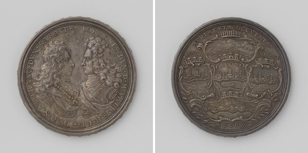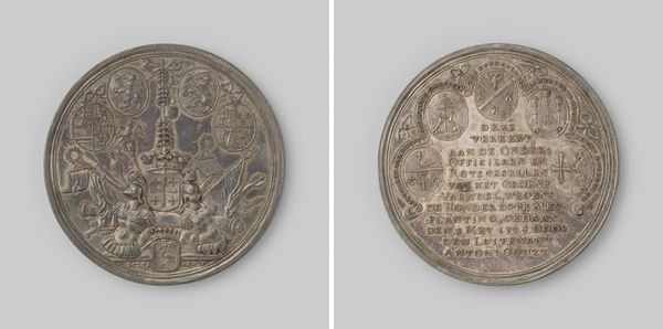 Editor: This is a commemorative medal titled 'Begin van het Congres van Wenen, ter herordening van Europa' made in 1814 by Johann Jakob Lauer. The bronze is densely packed with figures and symbols and appears quite formal and hierarchical. What strikes you most about it? Curator: Immediately, I see a deliberate visual argument about power and its supposed legitimacy after the Napoleonic Wars. Note the stark division on the medal, between those powerful men seated at a table, dictating terms, versus the imagery of subjugation. Editor: Subjugation? You mean the kneeling figure on the right side of the medal? Curator: Exactly. That posture is key. It visually encodes submission. Consider the iconography alongside it – the goddess of Justice looming over a cityscape perhaps intended as Vienna. The medal proposes a specific, very top-down perspective on how order is reimposed after upheaval, masking a more violent process. Editor: It’s almost like propaganda in miniature, using symbolism to convey a certain message about the Congress. But were those “terms” perceived fairly for every country? Curator: Absolutely not. And I think questioning whose narrative the medal is reinforcing is vital. It presents a seemingly divinely sanctioned, justified order, while masking the redistribution of power and territories largely benefitting the existing European elites. How might different populations across Europe – Polish nationalists, for instance – have viewed the 'reordering'? Editor: So, beyond the artistic skill, this piece functions as a statement of power, and its lasting value lies in revealing that statement critically. Curator: Precisely! It pushes us to deconstruct those claims of “order” and ask: order for whom, and at what cost? Considering art in this way forces us to reckon with how history gets memorialized and the inherent biases within these commemorations.