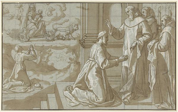 This is Pieter Jalhea Furnius's engraving, "Aankondiging van de geboorte van Christus aan Maria," made around 1600. The composition is stark, rendered entirely in monochromatic lines that articulate dramatic forms and textures. Our eye is drawn to the upper right of the scene where God is in the clouds, the dove of peace and the angel of annunciation are illuminated. The artwork is divided into two distinct yet interconnected realms. We see the Virgin Mary interrupted during her prayer, and the heavenly sphere in a state of divine irruption, as God announces that she will bear the son of God. This interplay between the earthly and the divine invites us to meditate on the threshold between the human and the transcendent. The scene is constructed upon a network of lines that convey light, shadow, and form. The engraving’s formal structure serves not only to depict a biblical event but also to invite contemplation on the very nature of faith, revelation, and the profound mystery of divine intervention in human history.