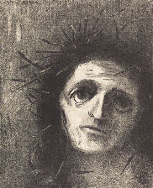 Editor: Here we have Odilon Redon's "Christ," a charcoal drawing. It feels heavy with sorrow and perhaps a quiet defiance. The gaze upwards is particularly striking. What's your take on this work? Curator: This piece invites us to consider the intersection of power, suffering, and representation. Redon, working within a Symbolist framework, uses the figure of Christ not just as a religious icon but as a symbol of human suffering and injustice. How does the use of charcoal, a medium that allows for such gradations of light and shadow, affect your understanding of this figure? Editor: It emphasizes the starkness and pain. It makes it feel very immediate, like we're witnessing a raw, unfiltered emotion. Curator: Precisely. And consider the crown of thorns. It’s not merely a symbol of religious persecution, but a broader commentary on the systemic oppression and violence inflicted upon marginalized bodies throughout history. Can you see any resonance with contemporary struggles against injustice? Editor: I do. It’s hard not to think about images of political prisoners or victims of violence that we see today. There’s a universal quality to the suffering portrayed. Curator: Exactly. Redon’s "Christ" transcends its specific religious context, becoming a powerful statement on the human condition, a mirror reflecting our collective capacity for both cruelty and compassion. What will you take away from observing this drawing? Editor: That art from the past can deeply connect with the present, and give a potent visual voice to those who fight for a better world. Curator: A truly excellent perspective!