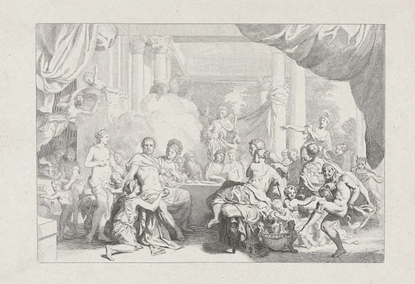 William Hogarth created this print, "An Election Entertainment," in England, likely in the mid-18th century, capturing the boisterous atmosphere surrounding political elections. The print shows a raucous scene of men feasting and reveling, highlighting the corruption and bribery often associated with the electoral process. Hogarth’s work provides a commentary on the social structures of his time, as this image visually critiques the institutions of power and the often-unethical practices within them. The specific details in the image, such as the overflowing table, the drunken behavior, and the exchange of money, create meaning through cultural references to the excess and moral decay associated with political corruption. The work might be seen as aligning with progressive ideas, challenging the existing social norms by exposing the darker side of political life. To gain a deeper understanding, historians can turn to period documents, political records, and social commentaries to reconstruct the cultural and institutional context in which Hogarth created this piece. Art’s meaning is not fixed; it evolves with our understanding of the social and institutional forces that shaped its creation.