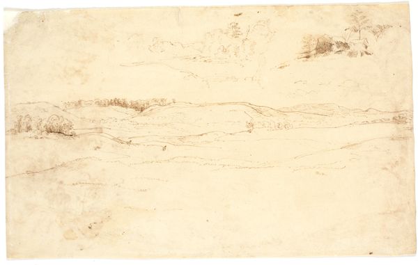 Editor: Here we have John Constable's pencil drawing, "Valley Landscape, Dove Dale" from 1801. It has such a subdued and dreamlike quality; almost monochromatic, it gives the landscape a monumental and timeless feeling. What do you see in this piece? Curator: I'm immediately drawn to the interplay of light and shadow – that very drama embodies the Romantic sensibility, the awe and sublime terror found in nature's grandeur. Dove Dale itself became, during that period, a visual shorthand for the power and insignificance of humanity when faced with nature’s ancient presence. Editor: It does evoke that feeling! So the composition then serves a purpose beyond just depicting a landscape? Curator: Absolutely. Consider the use of pencil; it's a very direct, immediate medium. But the *application*… Constable doesn't give us sharp edges; everything blends, hinting at something permanent. Dove Dale would have been a retreat. But do you feel a sense of that, looking at this? Or something else? Editor: Maybe…a geological, timeless presence. There aren’t figures or anything that would ground it to a specific narrative moment; instead, these looming rock formations feel very eternal. Curator: Exactly! Landscape became a stand-in for deeper cultural memories, and the persistence of certain narratives across time. He’s not just drawing a pretty valley. This piece touches upon something far greater and older than humanity. Editor: This has definitely broadened my view; seeing landscape as more than just scenery is very helpful. Curator: I hope that this discussion enables you to interpret further landscape works through their cultural lenses. It's truly incredible when these silent landscapes speak volumes!