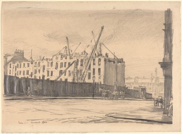 Curator: This watercolor by Sir Henry Rushbury is titled "A Ship in Dock." Editor: It's captivating, this image evokes such a somber, industrial mood. The muted colors really contribute to that feeling of stillness and perhaps even obsolescence. Curator: The artist has captured two large ships in considerable detail, their towering masts like skeletal arms against the pale sky. Rushbury's use of watercolor lends an ethereal quality to these behemoths of industry. The smokestacks and cranes imply a story of labor and global exchange. Editor: Yes, it's hard to ignore the backdrop of what looks like factories or warehouses. The ship isn’t just a vessel; it is tethered to a whole network of production. I wonder about the lives of the workers connected to these ships. Curator: Absolutely. Rushbury gives us more than a static portrait; he offers a glimpse into a specific moment in time, ripe with symbolism of industry, trade, and perhaps even the looming tensions of the early 20th century. Editor: Seeing this image, I'm drawn to considering labor's role within a broader capitalist framework. Curator: A powerful piece indeed, offering layers of symbolic and historical resonance.