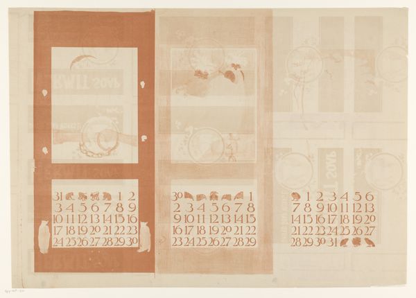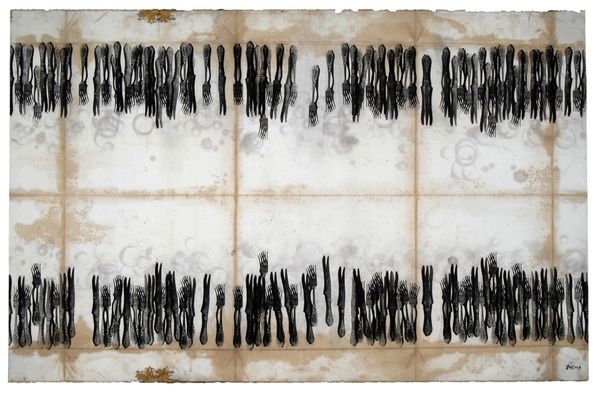 Pavlo Makov's "Attempt for Versailles I" presents a muted palette on what appears to be aged paper, establishing a somber, reflective mood. The composition is neatly divided into three horizontal registers, each featuring rows of meticulously rendered yet slightly decaying arboreal forms. The linear arrangement and the repetition of motifs invite a structuralist reading, suggesting a system or code is being explored. The attempt at Versailles, alludes to themes of control, order, and perhaps the futility of imposing strict geometries onto nature. Semiotically, the garden can be seen as a signifier of power and civilization. The visible decay and the washed-out colors, further destabilize these established meanings, questioning the permanence of imposed structures. The work functions as a poignant commentary on the transient nature of order, and the inevitable return of entropy.