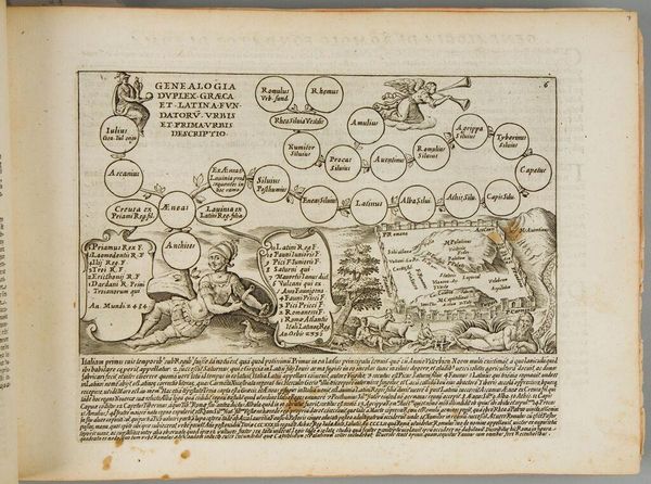 Curator: This engraving, "Stamboom van Christus," or "The Family Tree of Christ," was created by Tillmann Stella in 1555. I’m struck by the intricate detail rendered in what appears to be a fairly small-scale print. Editor: The piece has an almost map-like quality, a kind of codified visual representation that seeks to order and define. The way it merges image and script almost makes it reminiscent of calligraphy. The script must also play a huge role? Curator: Absolutely. The engraving blends figuration with an extensive amount of calligraphy, creating an organized visual genealogy of Christ. The various texts play specific roles such as identifying key figures, citing biblical verses, and expounding on the genealogy’s meaning, functioning as a legitimizing tool during the Reformation era. Editor: So it's an attempt to visually assert and defend a particular lineage and doctrine. I can imagine the craftsmanship involved – the meticulous labor and precision necessary to produce such detailed lines and text on the plate. What does the print medium say? Curator: Yes, consider how print culture facilitated the dissemination of religious and political ideologies. This artwork becomes part of a larger system of production and exchange. The use of engraving meant the image could be reproduced widely. So, the materials and production processes of the print, along with the calligraphy and composition contribute to its purpose. Editor: Seeing how the genealogy forms this organized system rooted in family ties suggests power structures encoded into a seemingly innocuous presentation of heritage. The lines create order. But do they liberate too? What are your impressions? Curator: It seems so, and beyond the hierarchical arrangement that works down the page and through the image is the overwhelming feeling of intent—of design meeting devotional and didactic purpose. What strikes me is the blend of artistry, religion, and meticulous record-keeping all presented within the confines of a print. Editor: Indeed. It’s fascinating how analyzing the visual elements brings a wealth of contextual understanding. It allows us to look past the artwork itself.