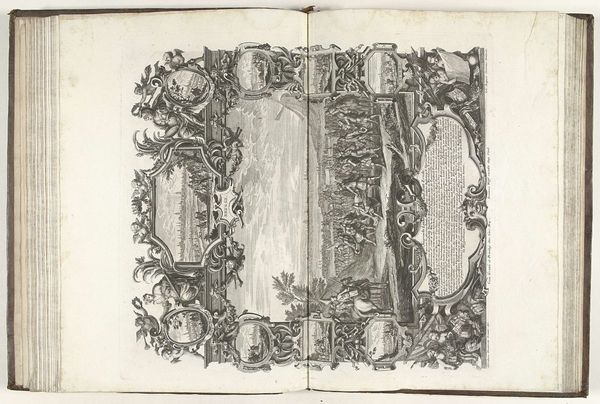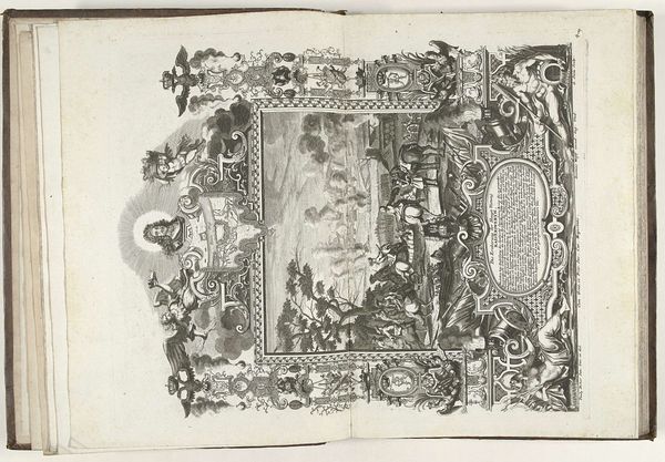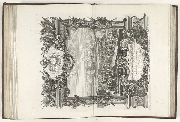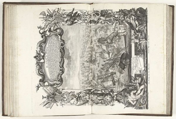 Curator: Here we have "Zeeslag in de baai van Vigo, 1702," an engraving created between 1712 and 1715 by Johann August Corvinus, residing here at the Rijksmuseum. Editor: My first impression is pure intricacy. Look at how busy this print is! The eye hardly knows where to land. The greyscale tones give it a somber feel. Curator: The piece commemorates the naval battle of Vigo Bay in 1702. Corvinus utilizes complex symbolism, like the allegorical figures around the main scene. See how they frame the chaos of war with emblems of power, victory, and perhaps even loss. The text on the right acts as a sort of written record, doesn't it? Editor: Exactly, but notice how even the allegorical framing speaks volumes about the material conditions and worldview surrounding the production of prints like these. Engraving requires skilled labor, precise tools, and expensive materials. It's about control—carefully imposing an image and narrative. The symmetry, even within that seeming chaos, speaks of imposed order. Curator: True, but consider that symmetry, or rather near-symmetry, also echoes the psychological urge to create balance amid turmoil. Those swirling patterns and figures reflect, perhaps, a hope for harmony and understanding after conflict. It also hints at cycles of power—rising and falling empires. Editor: The question remains for me, how does that symbolic intent relate to the hands that etched the plate? It speaks to the patronage systems. These artisans, commissioned to produce such works, translated events through very particular economic filters. And in terms of composition, it has more to do with commercial market demands than cultural healing. Curator: Perhaps both hold equal weight. Looking at it again, I can't deny how profoundly that technical craft translates, even centuries later, into this enduring statement about a pivotal moment. Editor: And I’m still marveling at how materials shape perception and meaning—a printed testament of both historical memory and a bygone production era.