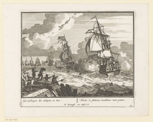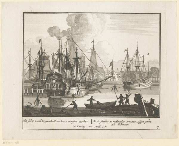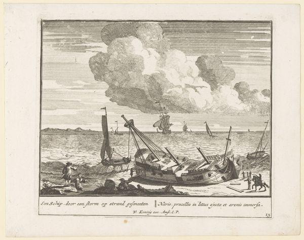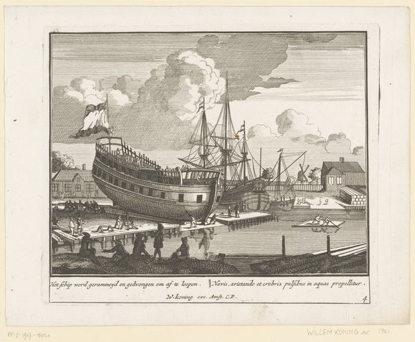 Curator: Looking at this print, currently held at the Rijksmuseum, we see Pieter van den Berge’s "Sloop van een oud schip", created sometime between 1717 and 1732. It presents a scene of a ship being broken down, quite methodically, in what appears to be a bustling Dutch port. Editor: My immediate thought is how fragile everything seems. It's a surprisingly melancholy image, even though it depicts industry. The skeletal remains of the ship dominate the scene, contrasting with the busyness of the surrounding activities. Curator: It's fascinating to consider the cultural context. During the Dutch Golden Age, shipbuilding was a symbol of power and prosperity. This print, however, portrays the lifecycle's end, highlighting the ephemerality of even the grandest achievements. This perspective could be reflective of broader social and economic anxieties of the time. Editor: Absolutely. You see how systematically the ship is being dismantled? It speaks volumes about labor and materiality. Each plank, each beam represents human effort being extracted and repurposed. Even the detritus visible in the foreground - the discarded bits – becomes a testament to the sheer volume of work. Think of the artistry and toil required to create that vessel in the first place, then this final act of methodical deconstruction. Curator: Precisely, the print makes us reflect on the intersection of commerce, decline, and renewal. The workers depicted here are not romanticized; they are shown engaging in the labor necessary for the cycle to continue, underscoring the interconnectedness of creation and demolition within society. Editor: I find myself drawn to the actual engraving itself – the dense network of lines creating a striking level of detail. It's another layer of process. You really feel the weight of those clouds. And consider the skills to render wood and water like this. We're witnessing not just the deconstruction of a ship, but a carefully constructed artwork too. Curator: An insightful observation. The act of depicting this scene transforms a common industrial activity into a moment of contemplation. The artwork is then not just reflecting but also shaping societal perceptions and values about labor and resources. Editor: Yes. It compels us to question how things are made, and what is considered valuable in any period. Even in the dismantling, labor’s imprint lingers. Curator: A somber note perhaps, but pertinent indeed, in understanding the values represented through Van den Berge's composition. Editor: For me, it speaks to our current dialogue surrounding materials and how we might be more considerate when constructing our own systems and societies.