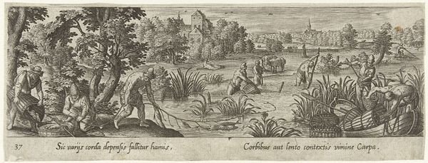 Editor: This print, "Men Fishing with Lines," from the Workshop of Philips Galle, depicts a group of men engaged in various fishing techniques. It’s fascinating how the artist portrays the labor involved. What stands out to you? Curator: Note the woven baskets and nets; these are meticulously rendered. Consider the labor and skill required to produce these tools, reflecting the economic and social structures that underpin this seemingly simple scene of fishing. The materiality speaks volumes. Editor: So, it's less about the act of fishing and more about the production? Curator: Precisely. It prompts us to consider the relationship between labor, resources, and survival in the context of this historical moment. How does this challenge traditional ideas of art? Editor: It makes me appreciate the everyday objects and the work behind them. Curator: Indeed, it elevates the mundane, revealing the art in the everyday.