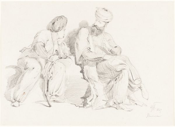 Curator: This is a drawing by Eustache Le Sueur, titled "A Judge and Two Gentlemen Lawyers." Look at these figures, captured with a delicate touch on toned paper, seemingly in mid-conversation, perhaps deeply pondering the implications of the law itself. Editor: Immediately, I’m drawn to the impermanence of it all, the sense of figures caught in a fleeting thought. It feels almost like witnessing a memory fade – soft lines, incomplete, a little hazy, like they could vanish if you looked away. Curator: Exactly. It’s the kind of sketch you might find tucked away in a personal sketchbook. Le Sueur experiments with light pencil work here, isn’t he? Capturing gesture more than concrete form, the sketchiness enhances the impression of a candid, unstaged moment. There’s no pretense to grandiosity, despite their formal roles, or is that because this is an internal thought? Editor: Or is it a peek into the performance of power? I wonder how deliberate Le Sueur's style choice was. Showing justice itself as unfixed, as a matter of perspective and... well, a little bit of fudging- could Le Sueur have intended something more daring than a quick practice? There's a deliberate quality about that leftmost figure... his body cloaked in the trappings of power. He turns away to avoid any messy, real connection, doesn’t he? Curator: Possibly. Remember that images of power, or images relating to the judicial system often operated through implied visual codes and subtle subversions. The legal world relied as much on perception and presentation as it did on strict interpretation of the law. Editor: Yes, there’s almost a theatricality. And maybe, Le Sueur’s style choices themselves become part of this performance, underscoring just how slippery, even subjective, authority can be when presented to the world. I keep wanting to dive beneath those quick strokes, hoping they lead somewhere absolute. Curator: And yet the absence of such absolutes may well be the point. Thanks to the drawing, it shows the fragility of judgment... so susceptible to light, shadow, and fleeting human gestures. A legal world based on anything BUT the black and white it sells to the masses. Editor: What I will keep from this image is the sense of capturing not the definition, but the feeling of legal discussions - full of gray areas and half-finished ideas, rendered in this delicate dance of light and shadow. Curator: A potent reminder that behind every seemingly impenetrable judgment, a mess of debate that needs to come to terms before action and consequence is dealt with, or not.