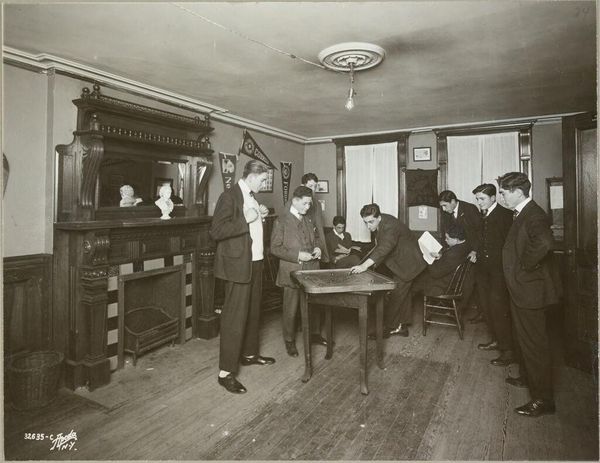 Curator: What an image! This photograph by the Geo R. Lawrence Co., titled "Social Settlements: United States. Illinois. Chicago. 'South Parks': South Parks, Chicago, Ill.: A Restaurant." pulls you right in, doesn't it? Editor: It does feel like a stage, almost theatrical. The lighting and sepia tones give it such a distinct, almost romantic melancholy, despite the mundane setting. Curator: The composition certainly guides the eye. Notice how the arrangement of figures creates these intimate groupings amidst the wider social scene, perhaps reflecting Chicago's evolving social fabric. Editor: Yes, I’m struck by the contrast—the public bar scene versus the very private, almost tense, interactions at that table in the foreground. Curator: It's a study in contrasts, alright! Lawrence, known for his innovative aerial photography, shows his mastery here too, capturing this moment, this social settlement, with such depth. Editor: Looking closer, the rigid formality of the patrons and the space itself really speaks to the era. It makes me think about the constraints they lived under. Curator: It's fascinating how a simple restaurant scene can reveal so much about society, isn't it? Editor: It is. I’m left pondering about the untold stories that the image holds.