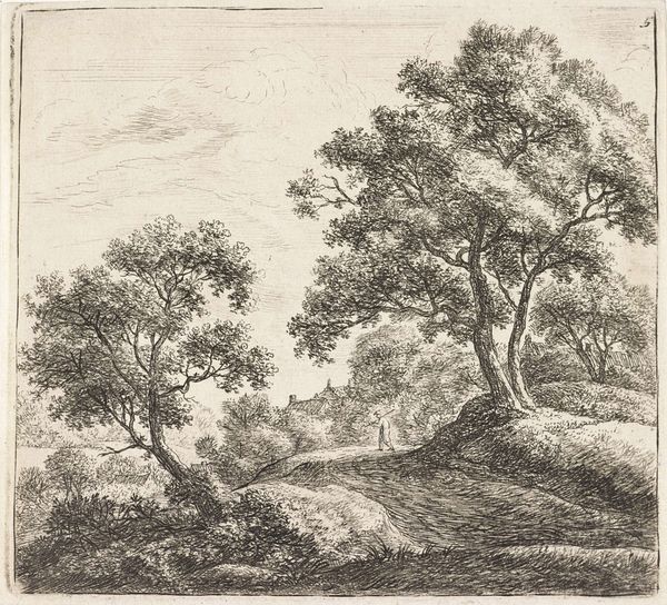 Reinierus Albertus Ludovicus baron van Isendoorn à Blois created this etching, titled "Landscape with Falconers," in the Netherlands during the early 19th century. The artist, a baron himself, presents us with an image steeped in aristocratic leisure. Falconry, depicted here, was a pastime closely associated with the European nobility. Note how the seemingly simple landscape is punctuated by figures engaged in this exclusive activity. This etching offers a glimpse into the social hierarchy of the time, reflecting a world where land ownership and leisure activities were markers of class distinction. To fully understand this work, we can explore estate records, historical accounts of falconry, and genealogical information about the artist and his social circle. By doing so, we can appreciate how art is not just a reflection of beauty, but a product of its social and institutional context.
