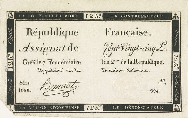 Editor: This is an Assignat, dating possibly from 1793 to 1799, a paper currency issued during the French Revolution. It’s made of paper, with typography and engraving. What strikes me is how such an ordinary object carries the weight of revolutionary ideals and turmoil. What symbolic layers am I missing? Curator: You've correctly identified the core irony here. A seemingly simple piece of paper embodies not only revolutionary ideals—Liberté, Egalité, Fraternité—but also a period of economic and social upheaval. Do you notice the other text printed around the border? Editor: Yes, “La loi punit de mort le contrefacteur" - the law punishes the counterfeiter with death and "La nation récompense le dénonciateur" - The nation rewards the informer. Those are strong symbols of a society dealing with very tough situations! Curator: Exactly! These phrases frame the central declarations of the Republic and offer a glimpse into the fears and values of the time. What about the design? Note the typography. It blends Neoclassical ideals with practical necessities. Editor: Now that you mention it, I see that contrast between the delicate calligraphy for the denomination and the stark pronouncements about counterfeiting. There's such a tension in this little rectangle, a fight to instill faith but with threats! Curator: The imagery evokes the ideals of the Republic. And then, in very direct language, what happens to you if you subvert those values. It’s a fascinating interplay of trust and coercion encoded in an object meant to facilitate exchange and build the nation. I wonder what kind of faith the citizens really had in these. Editor: I hadn’t thought of it that way, almost a contradiction embedded in something as simple as money. So much more to discover. Thanks! Curator: Indeed! And remember, objects like these are not just artifacts; they are vessels of memory, reflecting the complex tapestry of human experience.