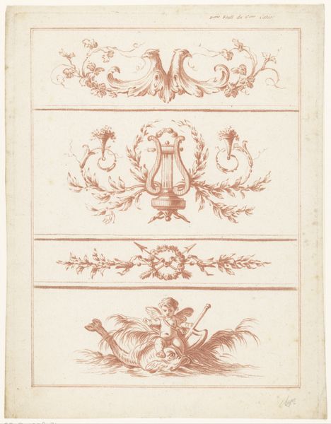 Editor: This is "Two Panels with Arabesques," an etching dating from between 1770 and 1780. It reminds me of wallpaper, almost like a decorative study. What stands out to you about its visual construction? Curator: The composition, inherently, speaks to the Rococo's penchant for asymmetry and ornamental flourish. Observe the sinuous lines, the delicate rendering of foliage, the integration of avian motifs with inanimate objects such as vases. It is through these structural relationships that the image manifests its essence. How do the forms interact, consider their relation within their individual panels? Editor: They seem to mirror each other without being identical, with common elements rearranged. The rooster panel feels bolder somehow. Curator: Precisely! Note how the artist uses line weight and density to achieve this variation in visual weight. The formal arrangement contributes to the piece's dynamism. Do you notice how the line is utilized to convey depth despite existing on a two-dimensional plane? Editor: I see that now, especially in the rendering of the rooster’s feathers and the vase’s curvature. Curator: Consider too how this etching functions beyond mere surface appeal. Etchings like this served a practical function for artisans. Note how the shapes become less refined at a lower resolution, their details less meaningful? The work presents the ideal form itself! Editor: So, beyond the immediate aesthetic, it offers a guide to crafting such designs? Curator: It transcends that limit and offers to explore ideal form itself, without which the craftsman would be powerless to reproduce something faithful to that ideal. Editor: This focus on line and form has revealed layers in what I first took to be just decorative. Thank you! Curator: The surface is often a mask; critical seeing can reveal a path towards its deconstruction. It has been my pleasure.