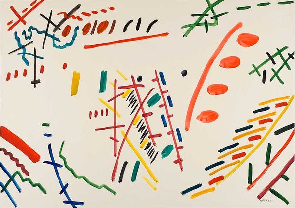 Joan Miró animated this canvas, titled L’Etoile se lève, les oiseaux s’envolent, les personnages dansent, with buoyant shapes and colours. Three dominant figures populate a field speckled with colourful dots, evoking a celestial or dreamlike space. Miró’s approach to form here recalls Surrealist and abstract art. The shapes are simplified and playful, appearing as characters in a visual game. Notice the interplay between the biomorphic forms and geometric elements, creating a dynamic tension. The colour palette—dominated by reds, blacks, and interspersed with blues, yellows and greens—contributes to the work’s overall sense of joyful, childlike wonder. Miró destabilizes conventional representation through abstraction, embracing instead a personal iconography. His art invites viewers to engage with a visual language that exists beyond fixed meanings, celebrating a fluid, ever-changing interpretation of form and space. The artist presents not a depiction, but an invitation to dance with the signs.