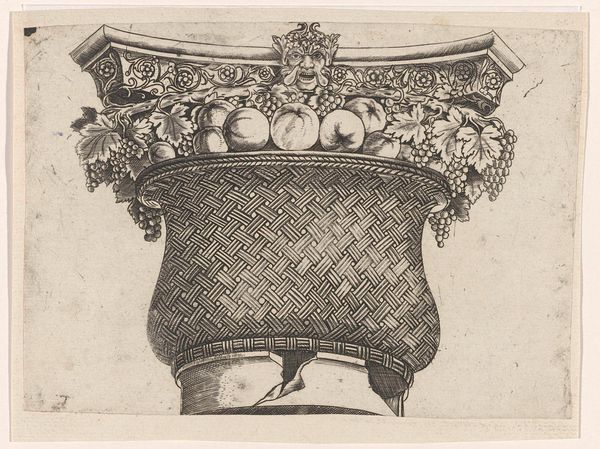 Monogrammist G.A. and the Caltrop created this print of a basket capital, part of the "Speculum Romanae Magnificentiae," a collection showcasing Roman architectural marvels. The stark contrast between light and shadow immediately draws the eye to the intricate basket weave forming the capital's body. The artist's use of hatching creates the illusion of depth and texture, animating the static architectural element. Above, fruit and grape leaves spill from the basket, crowned by a satyr head, disrupting the expected order of classical architecture. This juxtaposition of natural and constructed elements challenges the established rules of proportion and ornamentation. The basket weave itself, a vernacular material, is elevated to the status of high art, blurring the lines between craft and fine art. The print's composition and its focus on texture and form, invites a close examination of how meaning is created through visual structure.