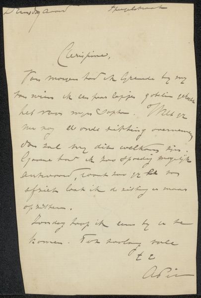 Editor: Here we have "Gedicht" by Maria Vos, likely from sometime between 1834 and 1906, judging from the dates provided. It appears to be ink on paper, perhaps a page torn from a sketchbook. The handwriting gives it an intimate, personal feel. What strikes me is the physical act of writing itself, pressing pen to paper to form these words. What can you tell me about it? Curator: Absolutely. This piece is fascinating when viewed through the lens of its materiality and the labor involved in its creation. Note the repetitive, almost meditative quality of the hand-lettering. Consider the paper itself - what kind was it? How was it manufactured? How readily available was paper during Vos’s time? This isn't simply about expressing a thought, but engaging in a very physical, tangible process, highlighting the labor of art making and its connection to the means of production available to Vos. Editor: So you're saying the value isn't just in the words, but also in the effort and resources used to write them down? Curator: Precisely! It’s a resistance to prioritizing the conceptual over the material. The social context here is crucial too. Was this for personal use? A gift? How might the act of hand-copying text challenge existing forms of mass-produced material, such as print? The act becomes a political one in itself. The materials used and process by which Vos created the "Gedicht" invites us to investigate artistic production, distribution and the relationship of craft and "high" art at the time. Editor: I hadn't thought of it that way before, focusing more on the emotional content. Now, I’m appreciating the value inherent in the material object and the manual effort itself. Thanks! Curator: And I am more interested to know about how such pieces like these relate to digital writing. The manual feel seems so much warmer!