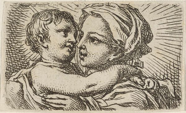 Curator: This intimate work is entitled "Madonna met kind" – or Madonna and Child. It's an ink drawing created sometime between 1618 and 1655 by Cornelis Schut and is currently housed here at the Rijksmuseum. Editor: It strikes me as immediately vulnerable, perhaps even apprehensive. The raw lines of the ink feel emotionally charged, and the figures seem to huddle together, as though for mutual comfort. Curator: Well, I would say that the Madonna and Child as a subject carries immense historical weight. This particular piece invites consideration within a larger framework of maternal representation and religious power dynamics, especially during the Baroque period, which saw increased polarization of spiritual ideals. It's intriguing how Schut negotiates these through line and form. Editor: Right, there’s a kind of desperate clutching depicted. Look at how the child's arm reaches, almost grasping at something just out of frame. To me, this implies a future, a destiny that is both desired and perhaps dreaded. We often read the Madonna as simply maternal love, but Schut is hinting at a premonition of things to come, and an underlying powerlessness against fate. Curator: And within that fate is inherent tension, not only religiously but also socially. During Schut's time, depictions of women, particularly within religious contexts, served specific ideological functions. His choice of stark ink lines could reflect broader social pressures exerted on motherhood and female virtue. There's something in the materiality here suggesting a subtle form of critique or perhaps empathy. Editor: The lines really vibrate, giving that intense quality, but what about the Madonna’s gaze, downward, inward… it's complex! What are the recurring symbols surrounding Madonna and Child imagery that speak to that psychology across time? Are they present, altered, or deliberately absent here? The cultural memory embedded in this archetype... fascinating! Curator: A cultural memory that Schut, knowingly or unknowingly, both perpetuates and slightly destabilizes with the choice of medium and the stark portrayal. The interplay creates such fascinating layers! Editor: It does, I’m not sure about critique exactly but this tension is what gives it its lasting appeal for me. Curator: Absolutely. These subtleties keep us coming back, to reconsider our reading of familiar figures in a transformed perspective.