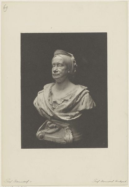 Curator: This is an untitled portrait by Martin Schweig, currently held at the Harvard Art Museums. Editor: The stark contrast immediately strikes me. It feels like a study in light and shadow, almost ethereal. Curator: Indeed. Consider how studio portraiture at the time provided a means of social mobility and representation. Owning such a photograph signified a certain economic status, reflected in the sitter's pearls and dress. Editor: The composition directs all attention to her face; the soft waves of her hair, the delicate curve of her neck. The material reality of the photograph almost disappears. Curator: However, we cannot ignore the labor involved in its production, from the photographer's work to the production of the photographic materials themselves. Editor: I agree, understanding the labor and materials used enriches our understanding of the image's context and cultural value. Curator: Precisely, each element contributing to a narrative beyond just aesthetic appreciation. Editor: It is a compelling image, then, offering multiple points of entry for understanding its complexity.