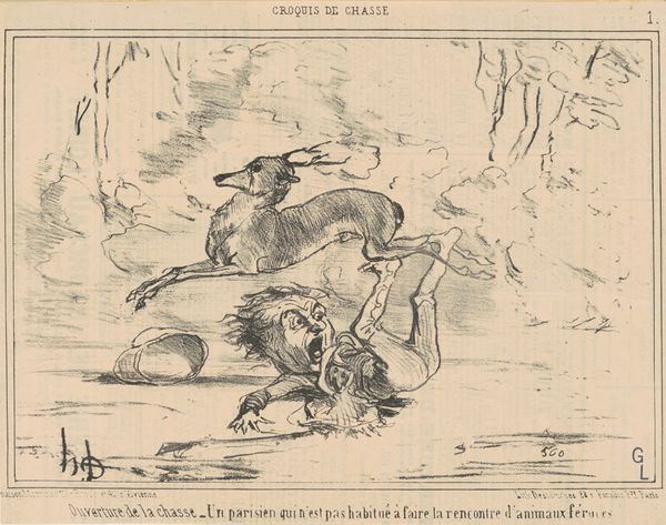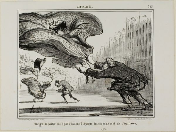 Curator: This is Honoré Daumier's "Le printemps annonçant son retour à Paris," a lithograph print from the 19th century. What are your initial impressions? Editor: A gust of wind rendered in ink! The composition is striking. Notice the swirling skirts dominating the foreground, their shapes echoed by the bending trees. There’s a real sense of dynamism. Curator: Daumier often used his art to comment on the social realities of his time, wouldn't you agree? This piece, in particular, seems to be offering a critique, maybe a humorous one, about how Parisians experienced the arrival of spring. Editor: I agree. I'm intrigued by Daumier's rendering of the wind. It’s almost a character itself. Look how it snatches hats and dictates the postures of figures. What does the wind itself represent here? The chaotic arrival of a new season or a larger metaphor about the forces shaping society? Curator: Perhaps both. Spring, here, could symbolize societal shifts—disruptive and even disorienting for some, particularly women whose physical appearance was rigidly controlled at the time. The whirlwind is turning things, and social expectations, upside down. Editor: Semiotically speaking, even the contrast between the solidity of the buildings and the ephemeral, windswept figures creates an intriguing tension. Curator: Absolutely. It seems like Daumier might also be playfully touching on themes of class and gender, don’t you think? Editor: There’s the tophat, escaping and being chased! That certainly hints at something—although, honestly, what dominates is simply how Daumier uses line and shading to express motion and a raw, energetic quality. The sketchlike lithography heightens the feeling. Curator: And while we admire the dynamism, we cannot forget that this work is deeply rooted in its cultural context. Daumier challenged the status quo using laughter. Editor: That tension is palpable—between pure visual energy and layered meaning. It speaks to the enduring power of art. Curator: It does. Each element pushing the boundaries of expectation.