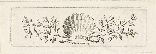 Curator: Today, we’re looking at Bernard Picart's "Ornament met schelp," an engraving created sometime between 1683 and 1733. It’s currently held here at the Rijksmuseum. Editor: It strikes me as a very ordered piece. A symmetrical composition centering around the shell motif with these sweeping decorative elements extending outward, there is definitely some rhythm to it all. Curator: Indeed. It's exemplary of Baroque decorative art, with the elaborate flourishes and emphasis on form. You see this aesthetic manifested across numerous media. Picart was celebrated as an engraver, especially for his precision. Consider the skill involved in creating such intricate linework! Editor: The medium, though, the engraving itself... it makes me think about reproducibility. It’s an image designed, effectively, to be mass-produced and distributed. We need to consider the engraver’s role within the larger framework of workshops and artisanal labor. Curator: While I agree that we need to appreciate the context of artistic production, let’s not overlook the visual impact here. The lines have an inherent quality. The shell is the nucleus, with the symmetry producing a sense of harmony. The curling forms beside it are also engaging. Editor: Sure, the composition is undeniably balanced, but isn’t it also functional? Consider how these kinds of ornaments were integrated into book designs or used to adorn furniture. It serves both an aesthetic and practical purpose. It would be worthwhile to explore who commissioned such work and its consumption within the market. Curator: All valid points! It shows, perhaps, that this is not a piece isolated from function, instead creating meaning both within its formal properties, and because of the external context in which it existed. Editor: I think that’s a wonderful intersection for thinking about this work, don’t you?