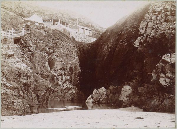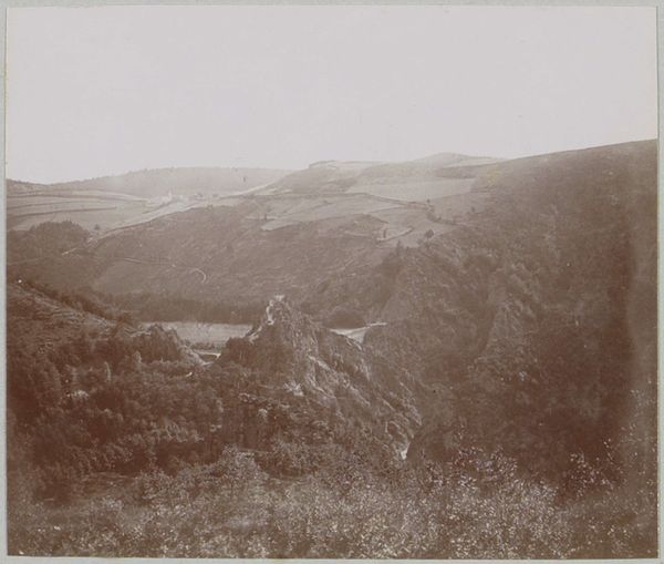 Curator: Welcome. Before us is a photographic work from 1902 by Delizy, titled *Gezicht op de Loire en het Kasteel van Lavoutte-Polignac in de Auvergne*, which translates to "View of the Loire and the Castle of Lavoutte-Polignac in the Auvergne." It's currently held at the Rijksmuseum. Editor: It feels almost ghostly, doesn’t it? That diffused light, the high vantage point, gives a sense of… removal. A kind of serene distance from the scene. Curator: Absolutely. The photograph leans into the pictorialist style, imbuing the image with an atmospheric quality. This softness, blurring, are intentional strategies for conveying a mood—in this case a connection to a Romantic-era past, now mediated by technological reproduction. The castle looms—both real and a symbolic vestige of earlier forms of power. Editor: I see the compositional strategy – that strong vertical axis created by the castle, rising from the complex tangle of the landscape below. Then there’s the winding river that guides our eye through the scene. It’s like a deliberate arrangement of masses and voids. Curator: Exactly. And that’s where the symbol of the river as temporal journey begins. It's an archetypal motif. Note the presence of human settlement literally *on* the mountain, almost integrated with the mountain's form: this image is subtly encoding memory, time, and power structures. The human imprint is very consciously portrayed. Editor: It also evokes a palpable tension between order and chaos. The castle represents imposing human will, yet it is literally built upon a rocky crag. And everything around that is tangled up. Curator: Indeed, it almost disappears into the environment—perhaps signaling its eventual, inevitable decay or change, something also inherent in pictorialism as a style of Romantic yearning. Editor: For me, analyzing how the shapes are distributed, the relationship between dark and light, that becomes a way into seeing how it functions aesthetically. Thank you for adding historical perspective to my understanding, it has definitely enriched my appreciation. Curator: The image's enduring appeal, I believe, comes from this dance between presence and absence, history and the present, creating an enduring conversation about time. It’s been a real pleasure looking into that interplay with you.