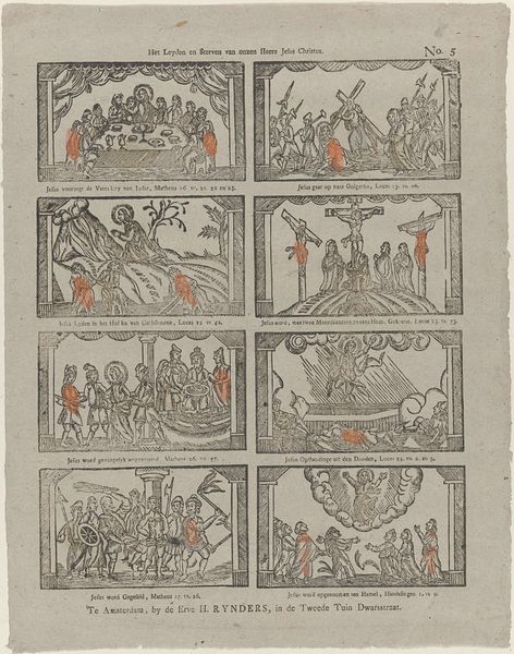 Curator: Oh, this engraving from somewhere between 1806 and 1830 immediately takes me to folk art forms—it's full of stories unfolding at once! Editor: Yes, I'm getting a rather narrative vibe, myself. Sort of like early comic strips. Each tiny panel showing Joseph's life. I wonder about the specific symbolism present—and the story Noman wanted to express through them? Curator: The inscription across the top, "De beelden die g'u hier op deze prent ziet geven, / Vertoonen u een schets van jozefs kuische leven," suggests he wants to explore themes of piety and innocence. It seems less like straightforward storytelling and more about imbuing familiar episodes with moral weight. Don't you think the use of many distinct rectangular forms helps focus your attention, in a controlled order? Editor: Indeed. This isn't meant to be a chaotic swirl, but carefully curated moments, right? I notice a specific set of tropes that he plays with; that visual language serves as a shorthand for a complex character... Do you sense a theatrical sensibility with the staging and characters, though? The whole artwork feels like a stage play—frozen. Curator: Absolutely. Notice, in the centre image, the symbolism of the light. It pours down on the figures in a really dramatic way, very theatrical lighting, emphasizing their divine purpose—in that single narrative frame...It is all about contrast and drama, no? Editor: Contrast is everywhere, literally! The engraver is obviously aware of the moral contrast represented here and he reflects them with intense black and white contrasts throughout—very potent imagery. One really *feels* the weight of his artistic license through the intense detail. Curator: Yes, well put. He doesn't just show, he wants to imprint a sense of profound moral insight. To create images that people will not just *see*, but remember. He has definitely created powerful stuff to behold. Editor: I concur completely. In our hurried contemporary lives, encountering something so methodically rendered feels rather refreshing and restorative.