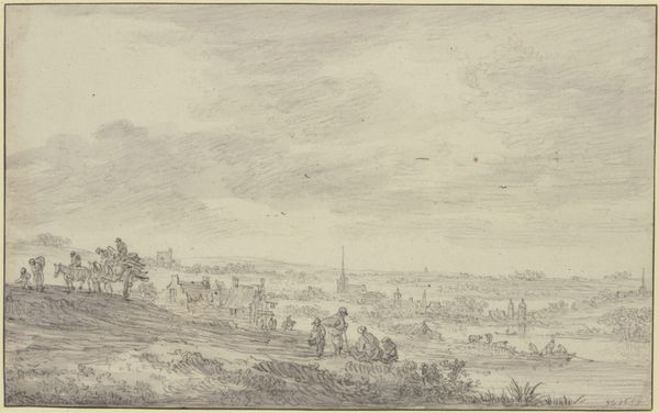 Curator: This is Jan van Goyen's "Strand mit einem Wagen und vielen Figuren," or "Beach with a Cart and Many Figures," created in 1653. The piece is crafted with ink and chalk. Editor: It's quite subdued, almost monochromatic, yet incredibly active. So many small figures populate this landscape, each seemingly engaged in their own activity along the beach. Curator: Van Goyen was masterful at capturing the essence of Dutch Golden Age landscapes. These weren't heroic or dramatic scenes, but rather slices of everyday life imbued with a certain… authenticity. Think about the socio-economic context of the time; this represents a burgeoning mercantile class enjoying leisure. Editor: And the cart itself seems rather important. Not just for carrying people, but as a symbol of commerce and travel, connecting the land to the sea. Look how the tower in the background provides a kind of visual anchor, suggesting the presence of a town or city not too far removed. What does the spire evoke for you? Curator: Church spires at the time often represented more than just religious devotion. They served as visible reminders of civic identity, a stable element amidst societal changes. The proximity of the figures grouped nearest it can also represent social station, even aspirations. The contrast is strong here as well, with a very distinct foreground/background contrast in lighting. Editor: There is so much contained in what at first glance appears a modest drawing, each little cluster a miniature world. Even the direction of the waves seems significant, leading the eye deeper into the composition and perhaps metaphorically leading towards…what exactly? Perhaps that sense of prosperous comfort you alluded to, subtly presented. Curator: Yes, precisely. Van Goyen shows us not only what the Dutch landscape looked like, but also what it meant to its inhabitants, representing through simple scenes complex socio-cultural values. Editor: I feel that. Examining van Goyen through this lends his art greater poignancy; so it is through his simple drawings and use of symbolic landscape imagery that cultural and personal experiences are so readily expressed, centuries later.