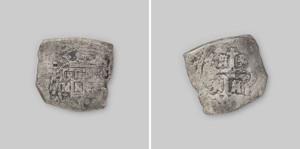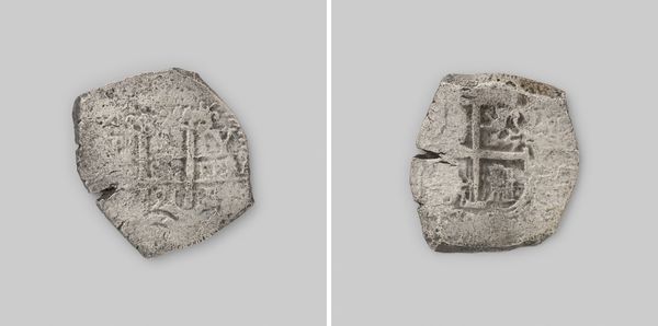 Curator: Here we have a fascinating piece: a silver "Reaal van achten," minted in Mexico in 1733. Quite extraordinarily, this particular coin comes from the wreck of the Dutch East India Company ship 't Vliegend Hart. Editor: It looks like a bar of soap, honestly. Beautifully weathered, but… more rustic than royal. I’m getting a powerful sense of history here. It's quite moving, this survivor of the sea. Curator: It’s interesting you say that, because while it functioned as currency, its crudeness of form speaks to the silver mining processes of the time in the Spanish colonies and also to its mass production and urgent shipping needs, right? This piece is Baroque, though heavily influenced by the necessities of function. Editor: That’s a keen observation. Seeing it this way… it reframes how I think about global trade, and about exploitation of land and people—it becomes this raw emblem of colonial ambition and how wealth was accumulated during the 18th century. Curator: Precisely. Its very form whispers tales of transatlantic voyages, maritime disasters, and economic power plays. There’s the romance of sunken treasure, of course. But also the stark reality of a globalized world taking shape, through often brutal means. Editor: I hadn't considered that the wear and tear isn't just accidental beauty; it’s essentially evidence, telling of the forces that created, and then destroyed the original coin. The water has worked away everything frivolous leaving this primal emblem of currency. It makes me reflect on what currency really represents... It all comes down to how we agree on meaning and value. Curator: Absolutely. In many ways, it's a perfect object of reflection. I wonder what other stories it can tell depending on who's observing it... Thank you for pointing this out; it truly enriches one’s perspective when observing its shape and material! Editor: Well, I leave with a renewed understanding of both value and loss represented in this little silver brick.