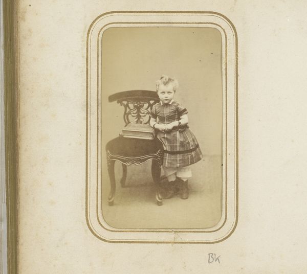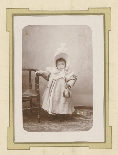 Curator: This is "Portret van een onbekend meisje," or Portrait of an Unknown Girl, dating from around 1871 to 1890. It's a photograph by Petz & Co., made in the style of a genre painting. Editor: She seems...solemn. The muted tones only amplify that, like a faded memory. It's captivating, though. It feels very staged, obviously, but with a haunting undercurrent. Curator: Yes, that air of solemnity was quite common for portraiture of that era, partly because of the longer exposure times required, demanding stillness. And the staging is intentional, echoing the compositions and themes explored in genre paintings. It blurs the line between photographic document and artistic creation. Note the draped curtain as a studio prop. Editor: It is interesting that you mention blurring the boundaries of art; that’s exactly what I was getting at with "haunting." It seems odd now, but portraiture from that period – and indeed photography itself – straddled this fascinating intersection. What materials were typically used here? Curator: This would likely be an albumen print, given the timeframe. The process involved coating paper with egg white and silver nitrate, creating a light-sensitive surface. This method offered detailed images and a warm, sepia tone that lends a romantic and nostalgic quality, like we see here. Editor: And you are certainly correct about nostalgic, looking at the photograph brings forth ideas of remembrance, sentimentality. The little girl's gaze, in conjunction with that old fashioned photo quality…It creates a compelling kind of melancholy! She is also in strange dress next to this wheel. What is it for? Curator: Well, during this era photography began being used for personal records or important events like births or accomplishments of any sort for family members. Perhaps her father bought her this small, human sized-wheel? Maybe, too, the family believed showing status mattered most. Editor: Regardless, the solemnness speaks to our own present too. I look at it as almost a form of quiet defiance against our oversharing present. She preserves, so we cannot consume her. Thank you for taking us on this thought! Curator: Of course! Examining this portrait reminds us of photography's journey from a technical process to a means of crafting narratives and memorializing specific classes throughout different eras.