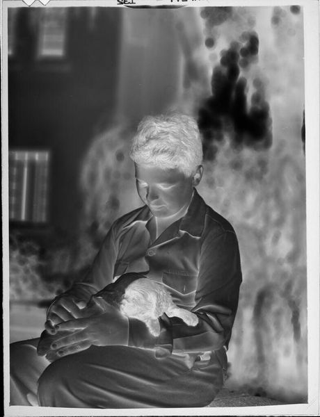 Editor: This silver gelatin print, "Untitled (man sitting at desk)" by Peter James Studio, presents a rather stark scene. The reversed tones create an unsettling mood. What does this emphasis on the photographic process reveal to you? Curator: The reversal highlights the labor involved. Consider the darkroom, the chemical processes. This isn't just capturing an image, but crafting one through tangible means. What does this say about the value placed on photographic work? Editor: It emphasizes the constructed nature of the image, and the skill in transforming material into art. I hadn’t considered the social implications before. Curator: Exactly. This challenges the idea of photography as mere documentation, reminding us of the labor behind every print. A powerful statement about production.